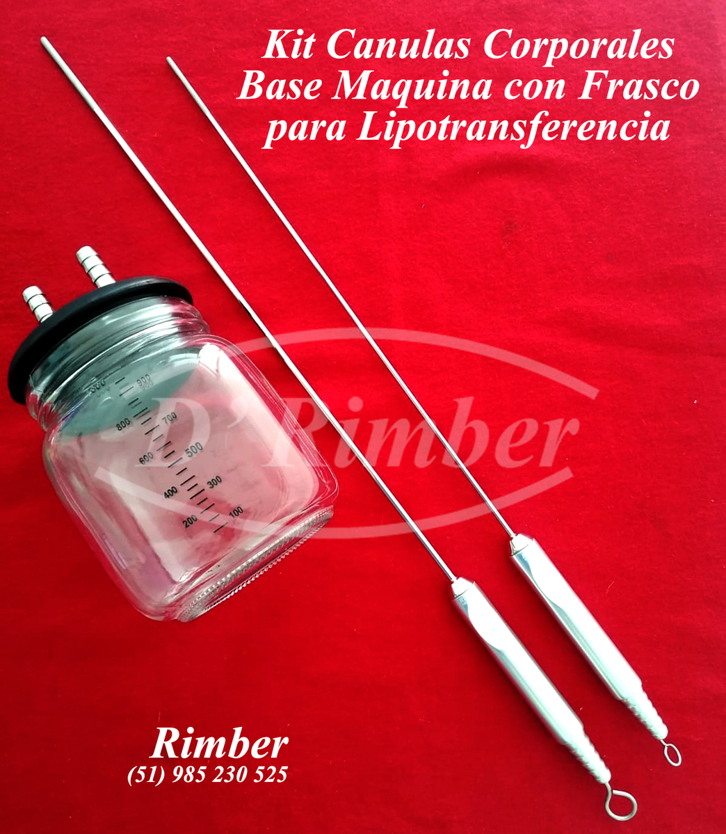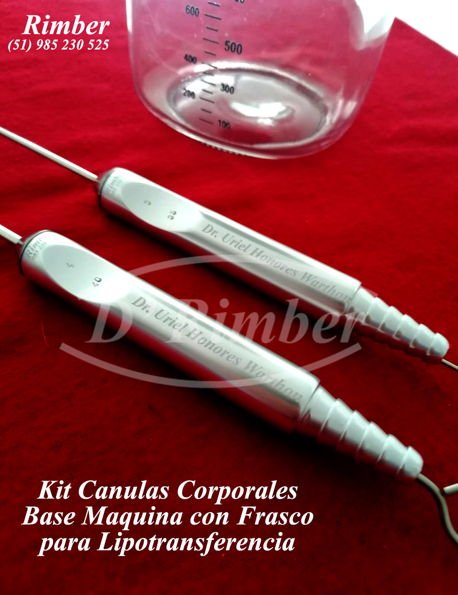 KIT CÁNULAS LIPOCORPORAL Y FACIAL BASE MAQUINA ERGONOMICA, CÁNULA BASE CÁTERTER PARA INYECCIÓN DE GRASA EN CADERA CON FILTRO NANOFAT Y MICROCANULAS DE INYECCIÓN ADEMÁS ACCESORIOS AUXILIARES (CONECTORES EN "Y", MANGUERAS SILICONADAS AUTOCLAVABLES PARA KLEIN Y LIPOSUPTOR) DESCRIPCIÓN: 01 can 2.5x15 base maquina ergonomica punta klein con sonda de limpieza